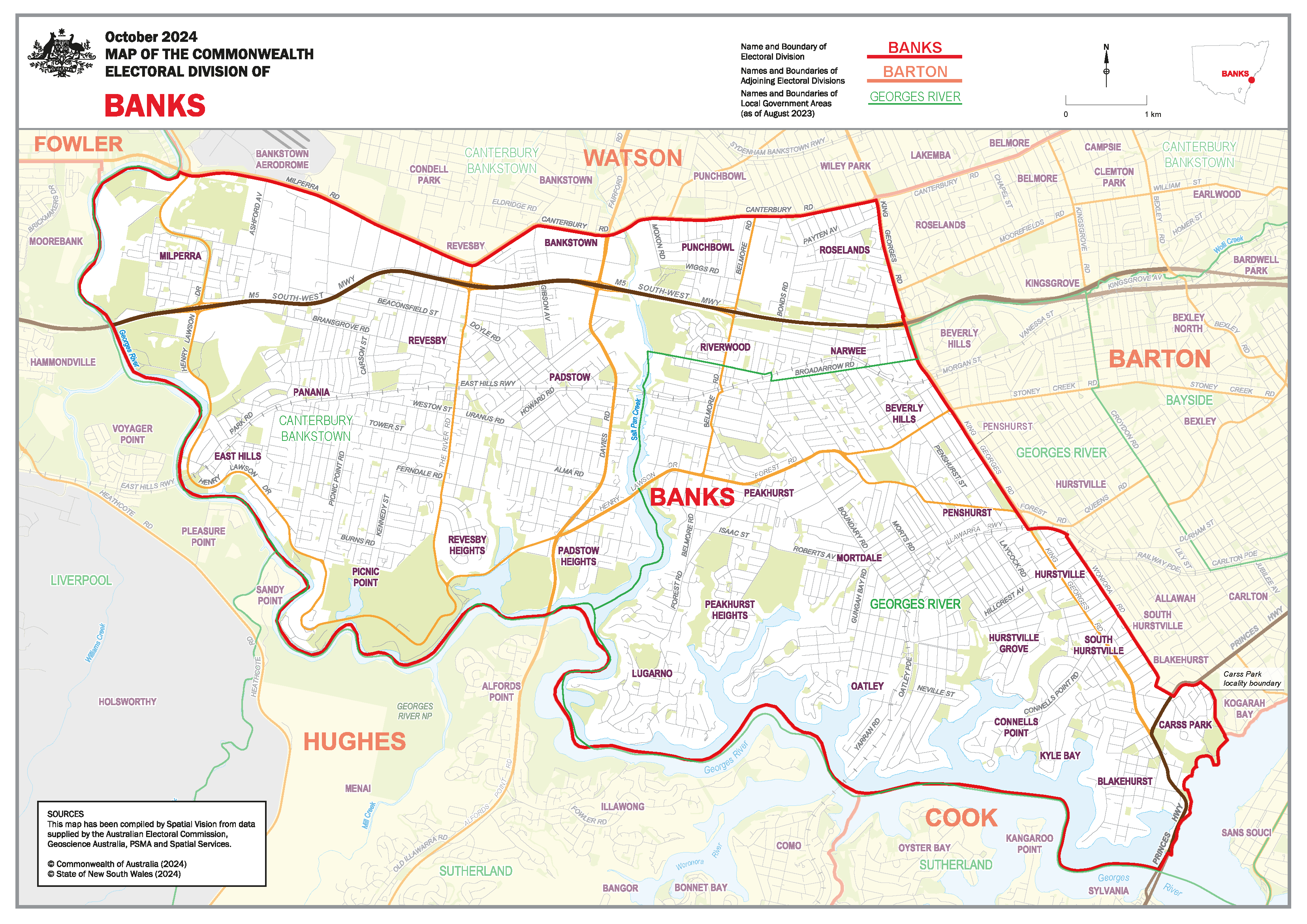The Banks electorate sits in Sydney’s southern–southwestern suburbs, stretching across parts of the Canterbury-Bankstown and Georges River council areas. Key suburbs include Revesby, Padstow, Panania, Peakhurst, East Hills, Lugarno, Oatley, Mortdale, Connells Point, and parts of Bankstown, Riverwood, and Hurstville.